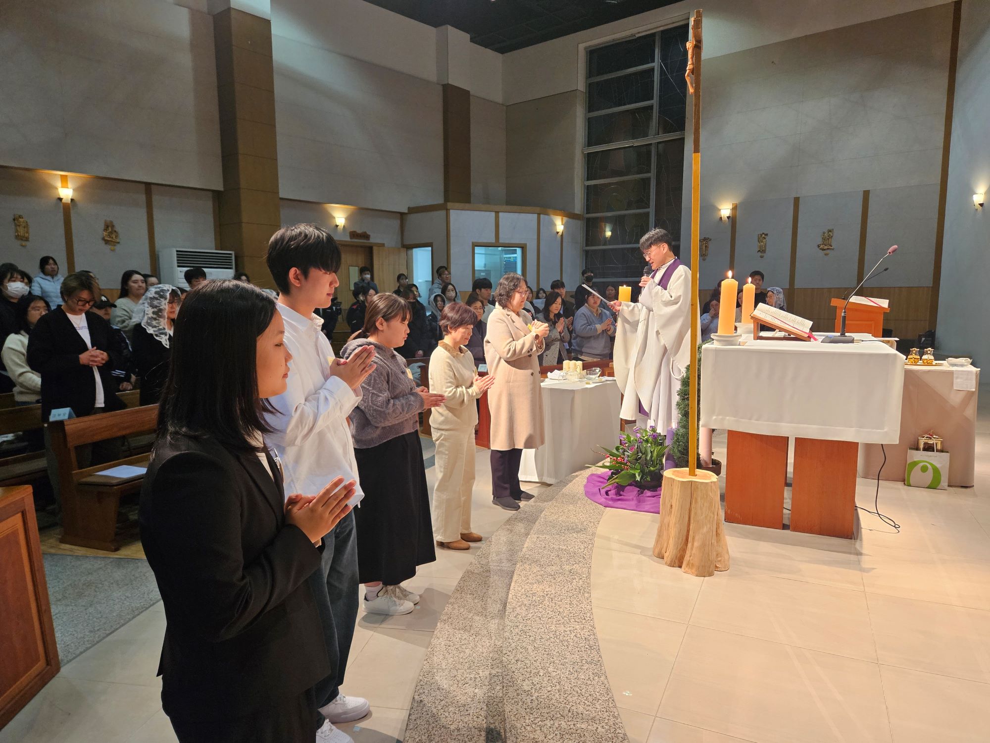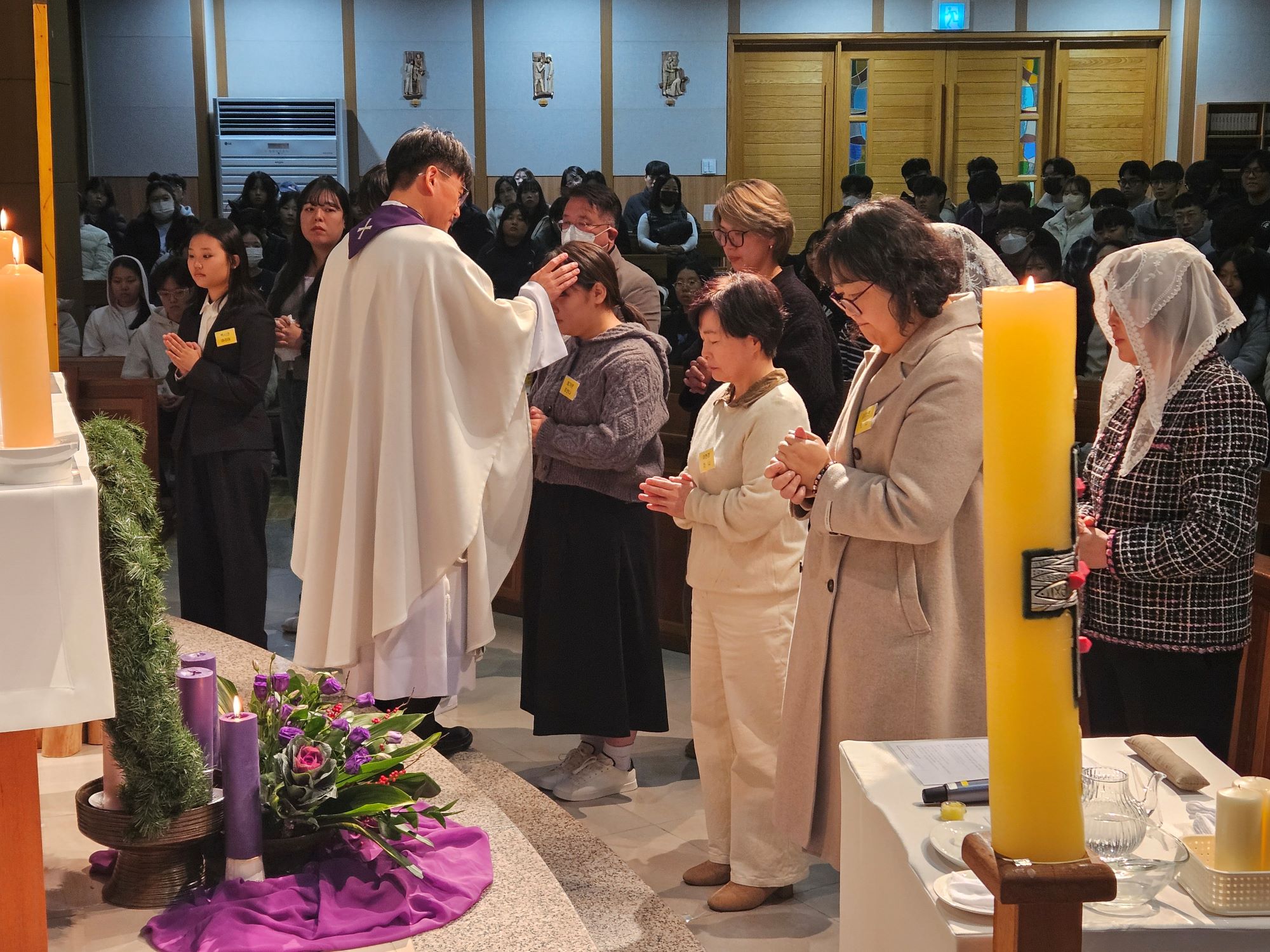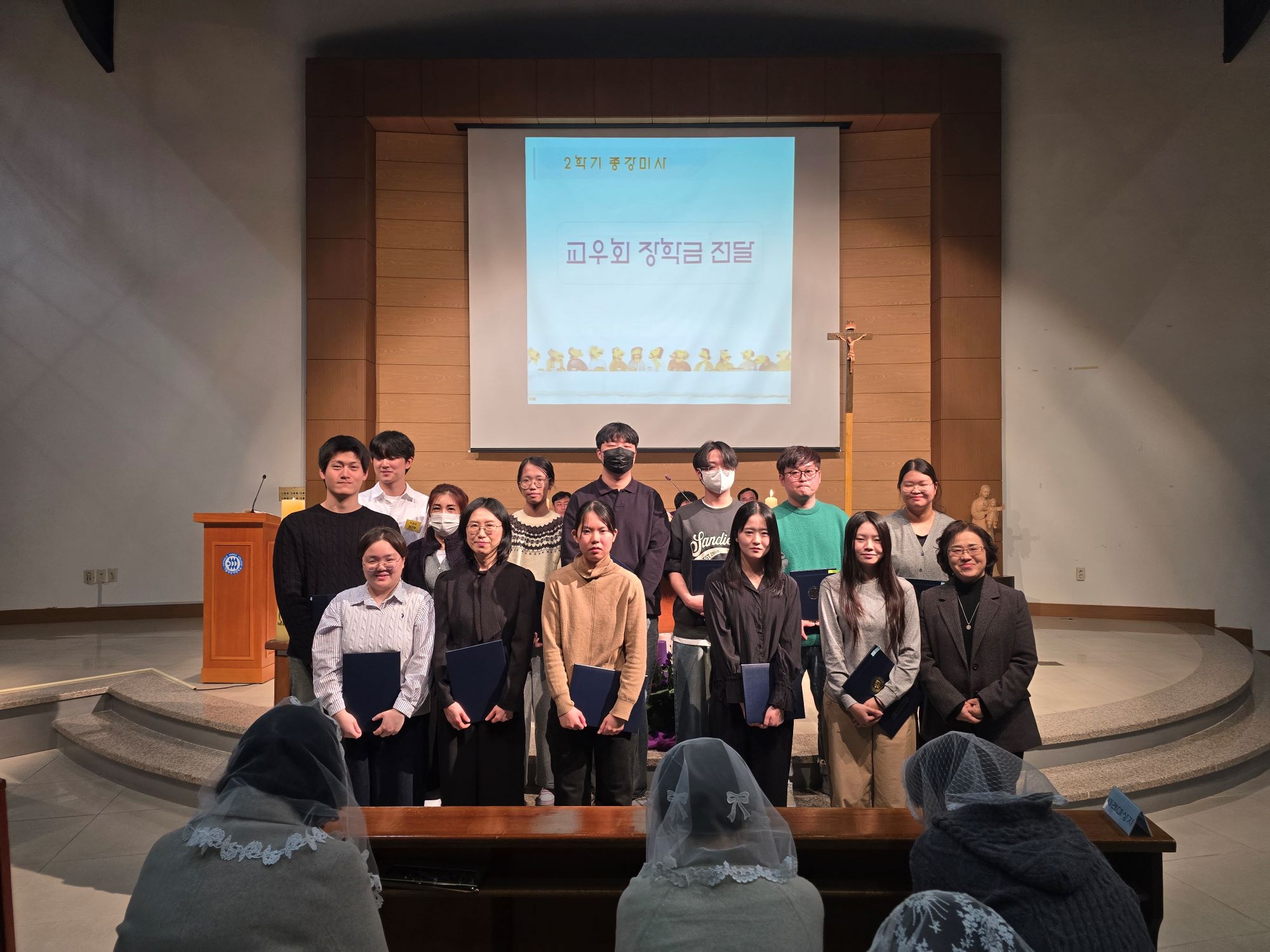 - 일시 : 2025년 12월 2일(화), 19:00 - 장소 : 두봉관 3층 성당 - 주례 : 교목처장 남상우 토마스모어 신부님 - 공동 집전자 : 총장 차호철 세례자요한 신부님, 사무처장 이형철 바오로 신부님 - 세례자 : 간호1 백시연(마리아), 최가은(조안나) 간호2 이현경(안나), 최종호(미카엘) 간호학과 김미연(보나)교수님 - 첫영성체 : 간호1 김승민(다미아노) - 가톨릭교우회 장학금 : 17명