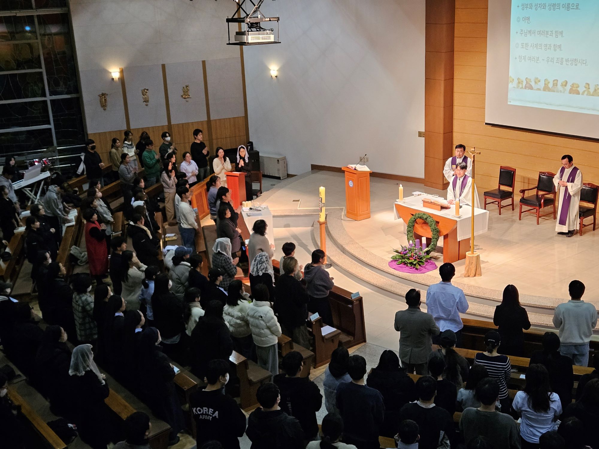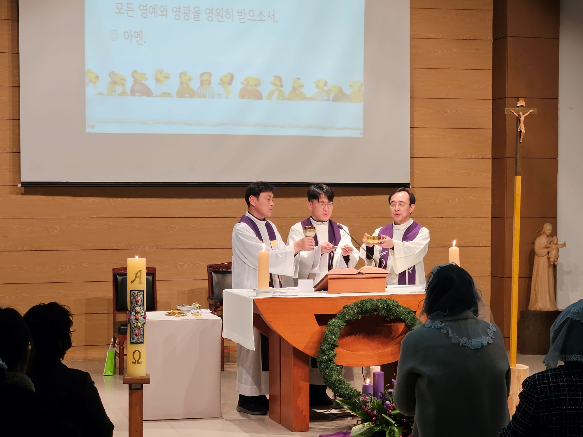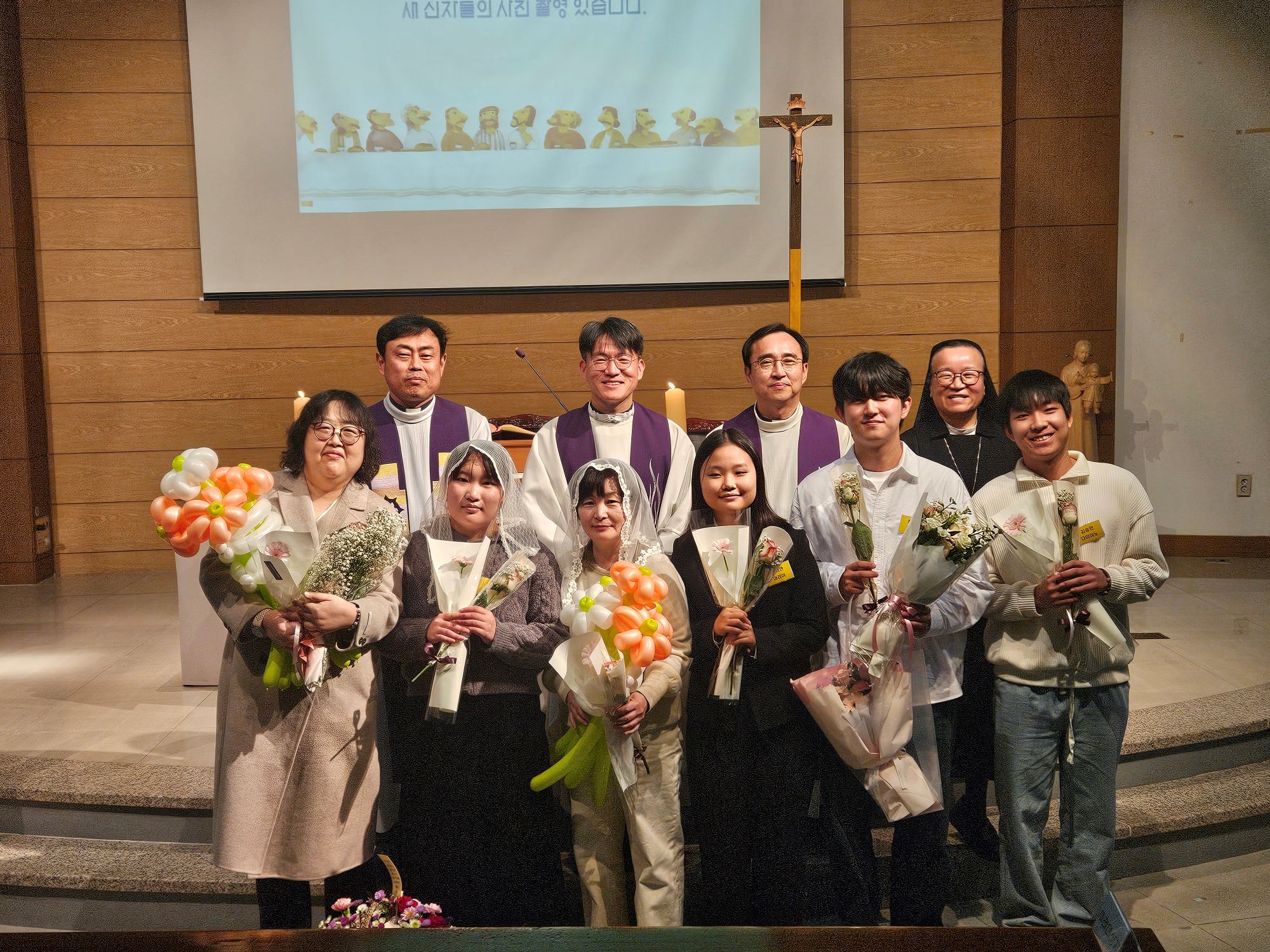 - 일시 : 2025년 12월 2일(화), 19:00 - 장소 : 두봉관 3층 성당 - 주례 : 교목처장 남상우 토마스모어 신부님 - 공동 집전자 : 총장 차호철 세례자요한 신부님, 사무처장 이형철 바오로 신부님 - 세례자 : 간호1 백시연(마리아), 최가은(조안나) 간호2 이현경(안나), 최종호(미카엘) 간호학과 김미연(보나)교수님 - 첫영성체 : 간호1 김승민(다미아노) - 가톨릭교우회 장학금 : 17명
